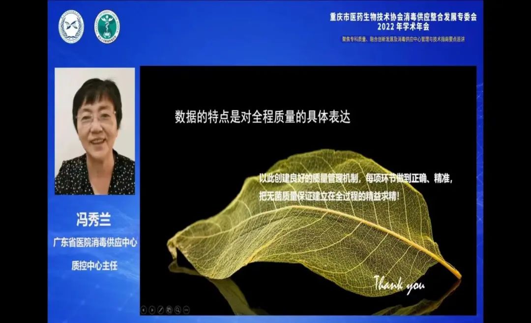 广东省医院消毒供应中心质量控制中心冯秀兰作《消毒供应中心质量管理的调整与变革》专题讲座。她以新视野思考质量管理系统现状、以标准为依据建立质量管理机制、以数据为基础的质量评价与指标等三个方面进行分享,为消毒供应中心的质量管理指明了方向。