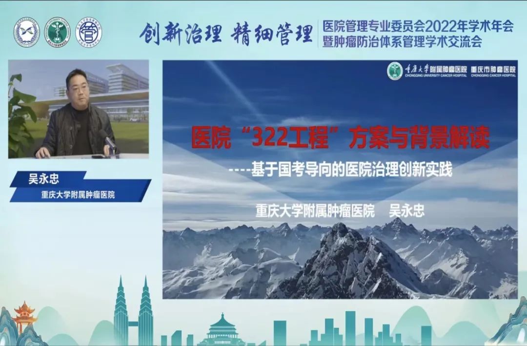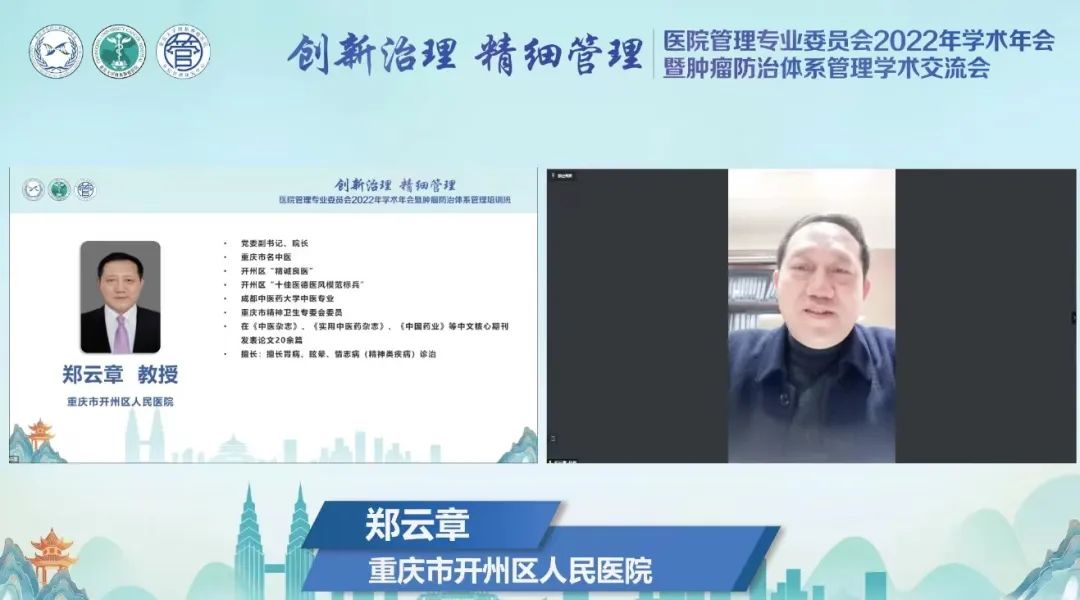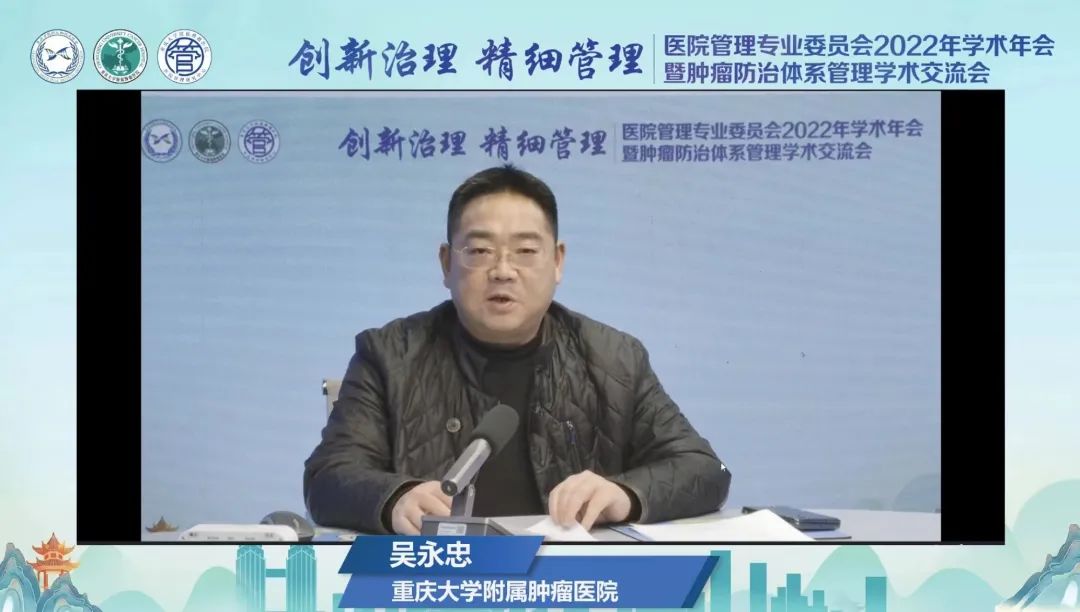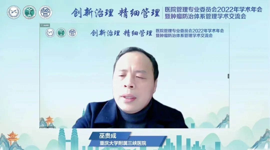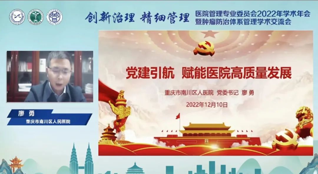 12月10日,由重庆市医药生物技术协会医院管理专业委员会、重庆大学附属肿瘤医院主办,重庆大学附属肿瘤医院管理研究中心承办的医院管理专业委员会2022年学术年会暨肿瘤防治体系管理学术交流会在线上举行,医院管理专委会全体委员和肿瘤防治体系成员单位从事医院管理工作的2500余名专业人员参加大会,共同探索医院高质量发展的新路径、新作为。