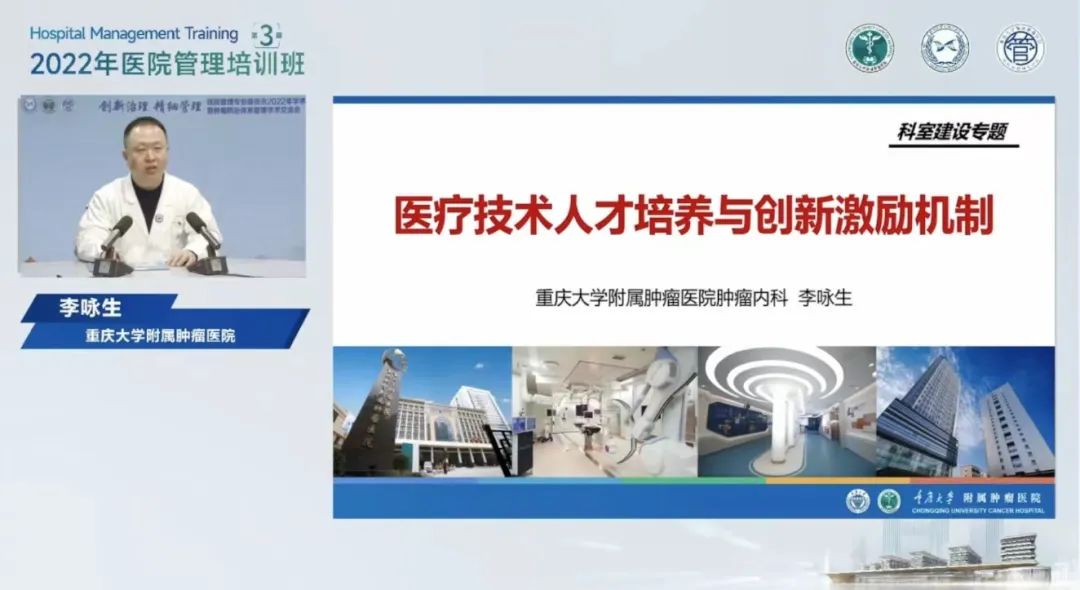 点面结合,把脉学科建设。重庆大学附属肿瘤医院科研外事部副主任张蕴蕴、人事部主任徐灵莉、肿瘤内科主任李咏生分别作《以学科建设助力医院发展》《深耕人才队伍建设 推动医院高质量发展》《医疗技术人才培养与创新激励机制》专题授课,他们紧紧围绕医院科研创新年建设要求,从宏观层面详细阐述了医院在科研管理、平台建设、人才培养等方面的系列创新经验,同时以具体科室管理为例,对各兄弟医院开展相关工作具有借鉴意义。