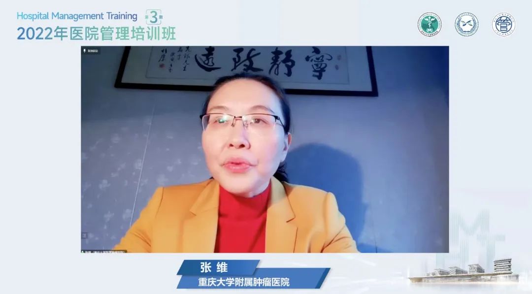 探讨热点,共话医院管理。专题授课期间,重庆大学附属肿瘤医院副院长周宏、王颖同重庆大学附属三峡医院副院长巫贵成、巴南区第二人民医院院长金刚、重庆大学附属涪陵医院工会主席罗晓、重庆大学附属沙坪坝医院党委书记赖利、合川区人民医院纪委书记程长容、荣昌区中医院党委书记喻蓉、开州区人民医院党委副书记、院长郑云章、巫山县人民医院党委书记张应春一道,紧紧围绕后疫情时代背景下推进医院高质量发展、精细化管理、病案首页质量建设与人才培养机制等内容,对医院管理焦点、热点问题展开深入研讨与交流,共同探讨公立医院高质量发展思路,为广大群众提供优质、高效的医疗卫生服务。