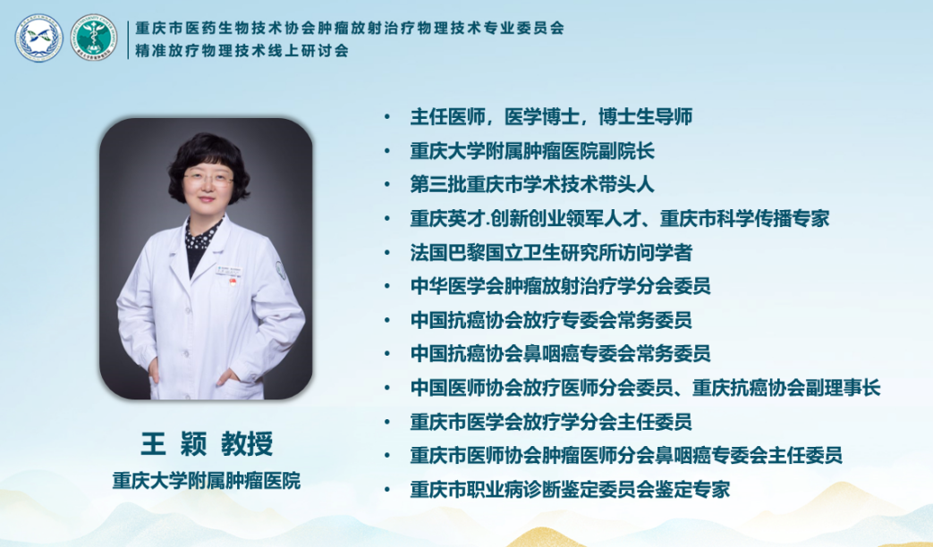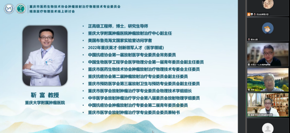 2023年1月7日,由重庆市医药生物技术协会主办,重庆市医药生物技术协会肿瘤放射治疗专业委员会、重庆大学附属肿瘤医院承办的“精准放疗物理技术线上研讨会”召开。重庆大学附属肿瘤医院副院长王颖教授和山东省肿瘤医院放射物理技术科主任尹勇教授任大会主席并分别为大会致辞,肿瘤放射治疗物理技术专业委员会主任委员靳富任大会执行主席并主持开幕式。