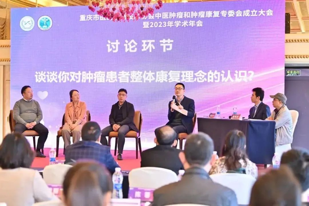 重庆市涪陵区中医院肿瘤科主任刘爽、重庆市九龙坡区中医院肿瘤科主任沈健、铜梁区中医院肿瘤科主任熊本立、重庆医科大学附属第一医院胃肠外科副主任医师吴星烨,围绕肿瘤患者整体康复的相关话题进行现场讨论。