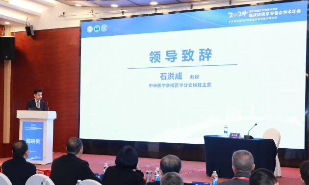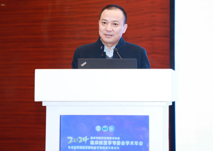 重庆市医药生物技术协会秘书长郑晓东致辞。他向远道而来的各位嘉宾、专家学者以及奋战在核医学领域的同仁们表示最热烈的欢迎和最诚挚的感谢。他表示,核医学作为现代医学的重要组成部分,在肿瘤、心血管疾病、神经退行性疾病等多个领域发挥着不可替代的作用。过去的一年里,重庆市医药生物技术协会在临床核医学领域取得了显著的成绩。共同见证了多项创新技术的临床应用,参与了多项国家级、省市级科研项目的攻关,也见证了核医学专业人才队伍的不断壮大和学术影响力的持续提升。这些成绩,离不开专委会的付出与奉献,也离不开广大医务工作者的共同努力和不懈追求,期待通过本次会议共同探索核医学发展的新路径、新模式,为推动健康中国战略贡献智慧和力量。