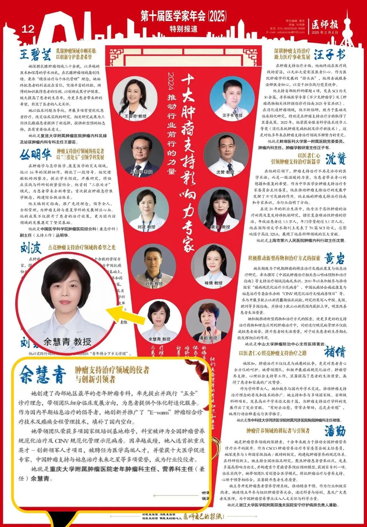近日,由《医师报》社主办,中国医药卫生事业发展基金会、中国医药卫生文化协会支持,医师网、医TV、《中国医院院长》杂志社、《中国社区医师》杂志社协办的第十届医学家年会(2025)在北京召开。本次年会对那些为推动医疗行业前行的精英致以敬意,颁发了“致敬医界丰碑”“推进行业前行的力量·行业篇”系列荣誉。重庆市医药生物技术协会癌症康复与姑息治疗专业委员会,重庆大学附属肿瘤医院老年肿瘤科主任、营养科主任(兼任)余慧青教授荣获“推进行业前行的力量”2024年度十大肿瘤支持治疗影响力专家荣誉称号。