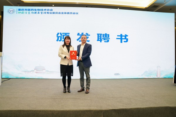 重庆大学附属肿瘤医院健康体检与肿瘤筛查中心主任赵玉兰当选重庆市医药生物技术协会肿瘤筛查与健康管理专业委员会主任委员,重庆市医药生物技术协会秘书长郑晓东为其颁发聘书。
