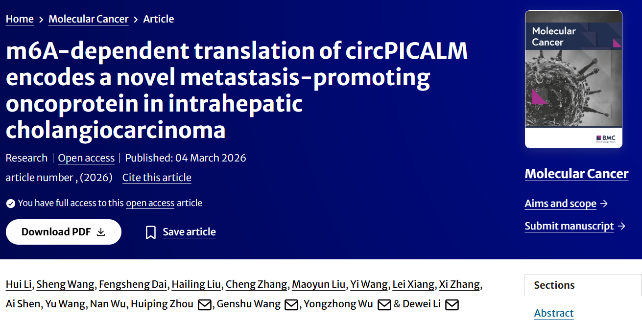 2026年3月4日,重庆大学附属肿瘤医院吴永忠/李德卫/李慧教授团队在Molecular Cancer(中科院一区TOP期刊,IF:33.9分)杂志上发表题为《m6A-Dependent Translation of CircPICALM Encodes a Novel Metastasis-Promoting Oncoprotein in Intrahepatic Cholangiocarcinoma》(m6A依赖性环状RNA circPICALM通过其编码的新蛋白促进肝内胆管癌转移)的研究论文。该研究首次揭示m6A修饰的环状RNA circPICALM可翻译生成新型蛋白 circPICALM-219aa,并通过拮抗SOCS3激活IL-6/JAK/STAT3信号通路驱动肝内胆管癌转移的核心分子机制,为胆管癌转移机制研究和精准治疗提供了新的理论依据与潜在靶点。