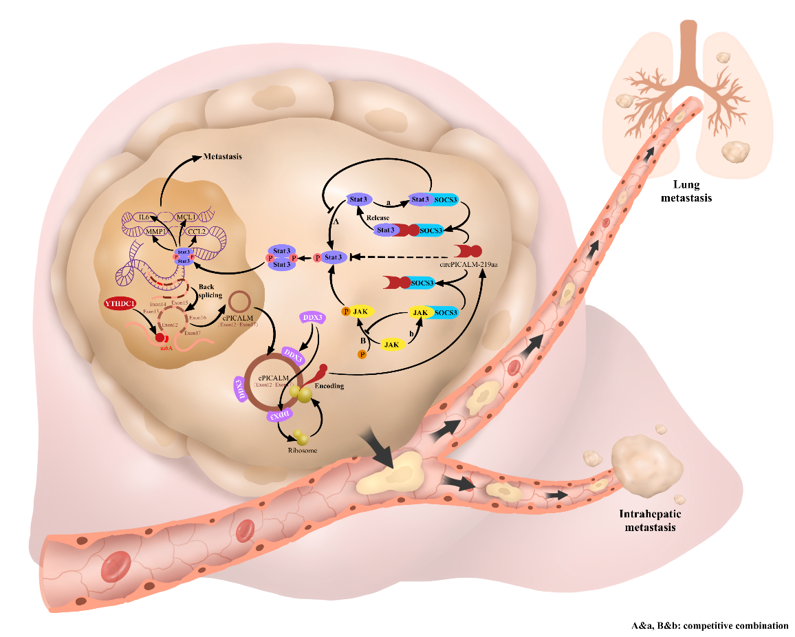 本研究的创新性体现在三个层面:一是首次发现 circPICALM 编码的新型癌蛋白 circPICALM-219aa 是肝内胆管癌转移的关键驱动因子;二是揭示了 m6A 修饰结合 DDX3 调控环状 RNA 翻译的全新机制,拓展了对环状RNA功能和调控的认知;三是提出 circPICALM/circPICALM-219aa/SOCS3/STAT3 调控轴作为肝内胆管癌转移的潜在治疗靶点,为靶向IL-6/JAK/STAT3 通路的精准治疗提供了新的切入点。这为理解肝内胆管癌转移的分子机制提供了全新视角,也为开发肝内胆管癌的靶向治疗策略开辟了新途径。