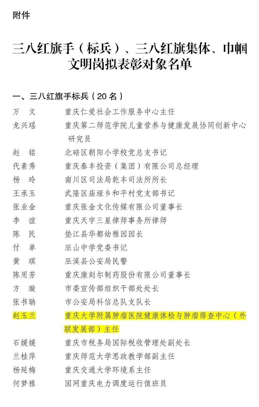 近日,重庆市人力社保局、重庆市妇联联合发布了重庆市三八红旗手标兵、三八红旗手、三八红旗集体、巾帼文明岗全名单。其中,重庆大学附属肿瘤医院健康体检与肿瘤筛查中心主任赵玉兰荣获“重庆市三八红旗手标兵”称号!