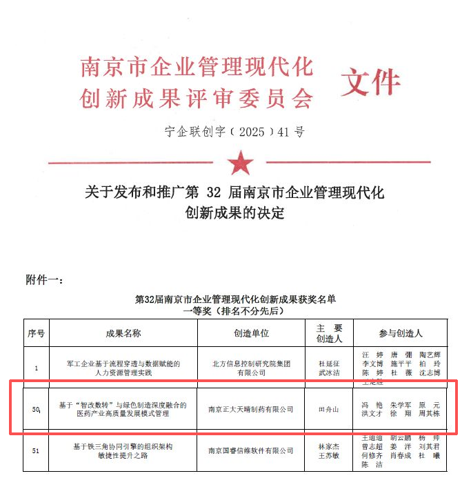 据悉,为落实“十五五”规划相关部署,充分激发经营主体活力,凝聚政企协同发展合力,南京市企业联合会组织开展了第32届南京市企业管理现代化创新成果评选工作。经过严格的审核、公示流程,公司申报的《基于“智改数转”与绿色制造深度融合的医药产业高质量发展模式管理》创新成果荣获一等奖。