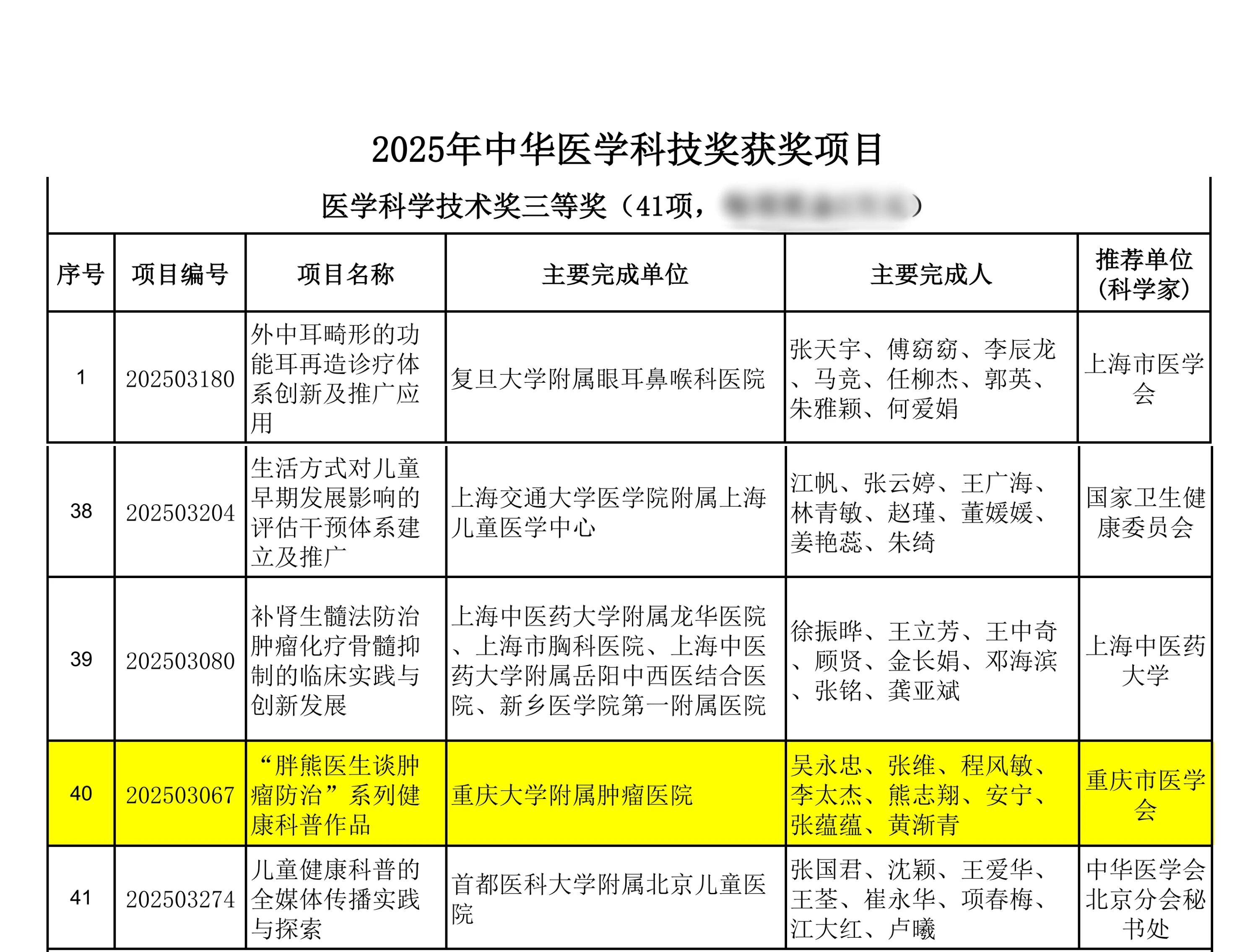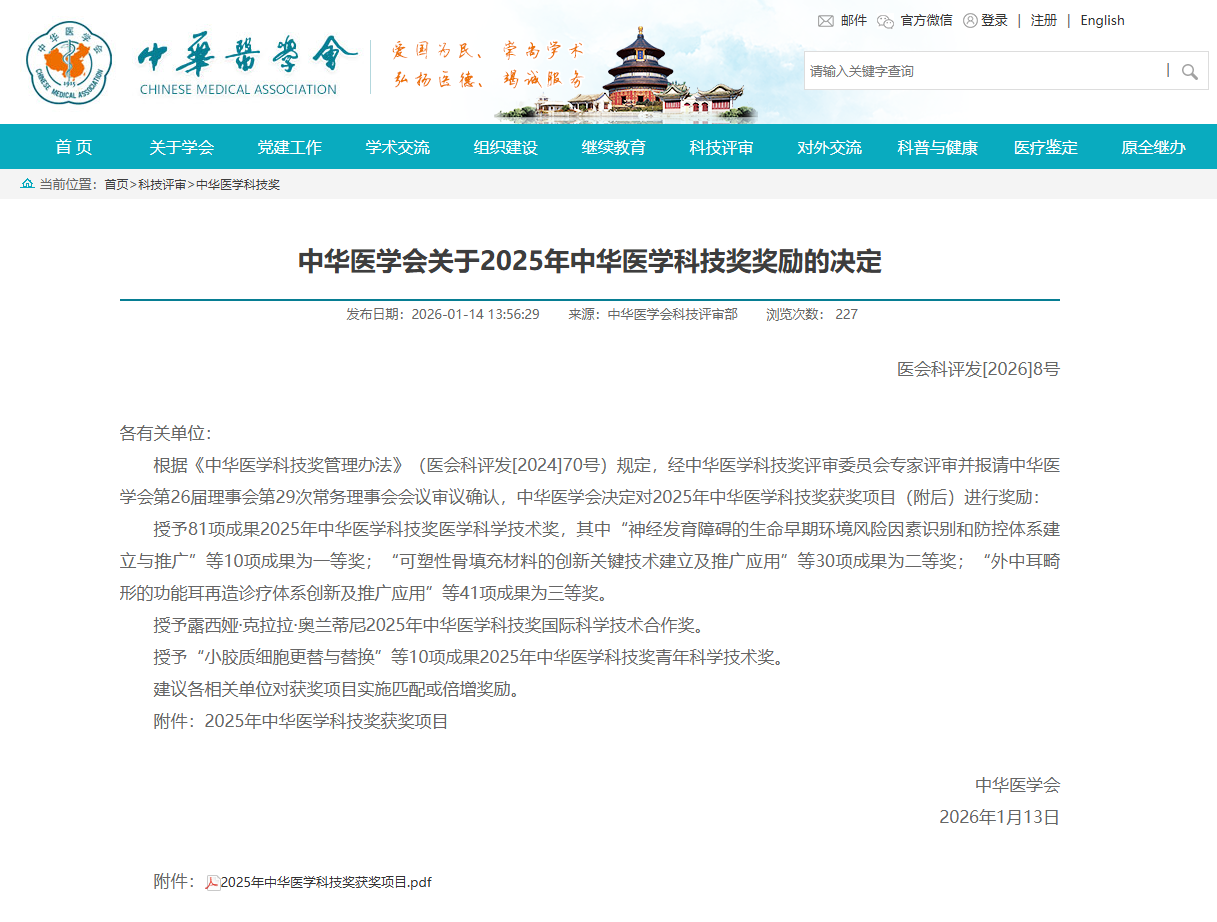 1月14日,中华医学会正式公布了2025年中华医学科技奖名单,全国共有81项成果获奖,其中仅2项成果为科普类项目。由重庆大学附属肿瘤医院吴永忠教授牵头完成的“胖熊医生谈肿瘤防治”系列科普作品荣获中华医学科技奖(科普类)。这是中华医学科技奖自‌2008年‌开始增设科普类奖项以来,西南地区首次荣获该奖项。