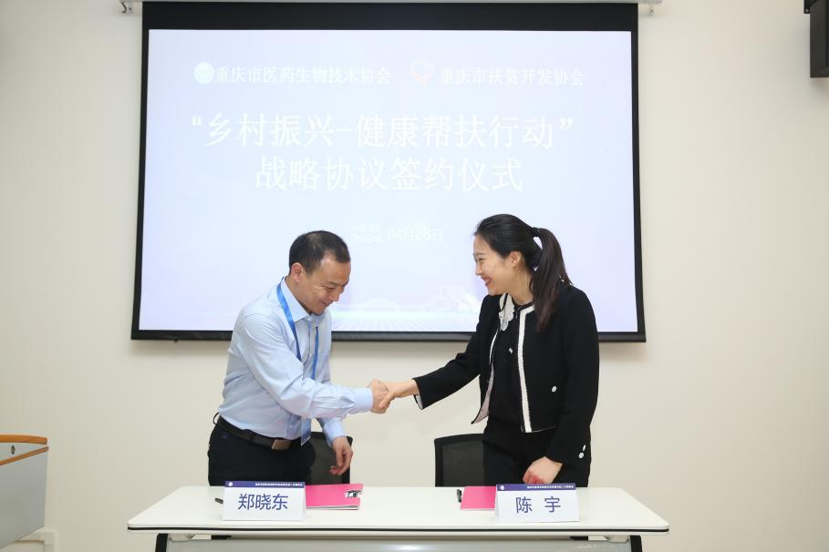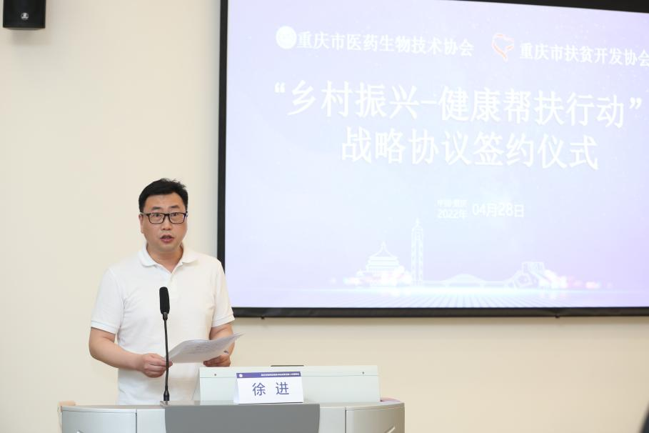 会议上,重庆市医药生物技术协会同重庆市扶贫开发协会达成合作,完成了“乡村振兴-健康帮扶行动”战略合作签订暨授牌仪式。仪式上,重庆市扶贫开发协会副会长徐进发表讲话,他表示,未来两个协会间将继续加强合作,积极推动乡村振兴工作,为医药生物产业成果转化尽一份力。