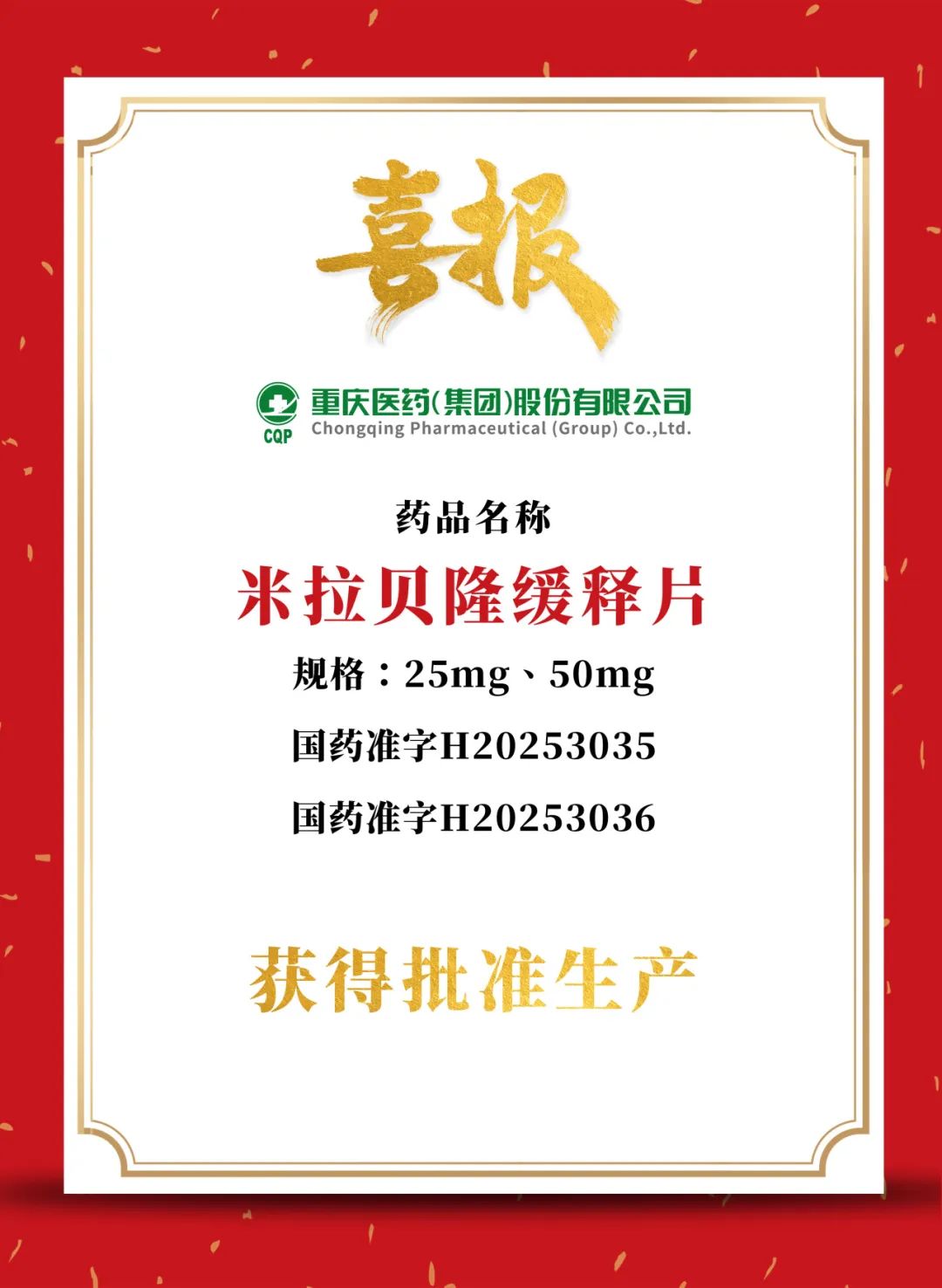 会员之窗 | 重药集团第四个MAH产品米拉贝隆缓释片正式获批生产
