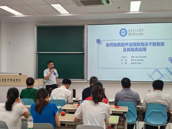 “食药物质超声波提取物冻干粉制备及其临床应用”项目是我院科研转化项目,食药物质提取物冻干粉采用西部领先的超声波破壁、-86℃超低温真空提取冻干技术制备,应用于临床营养干预半年,累计使用24000+支,干预3700+人次,覆盖营养会诊量的40.9%。院内已经建立“中西医结合医疗膳食”服务店及“食药物质提取物冻干粉”的临床应用,搭建 “配方研发—标准生产—临床应用—优化迭代”一体化可持续服务模式,开发川渝道地药材特色复方制剂及药食同源饮品+糕点+餐食,打造重庆市人民医院 “中西医结合食药物质调理” 品牌内核,通过“智能营养决策系统”,实现 “食药物质进万家”惠民目标。