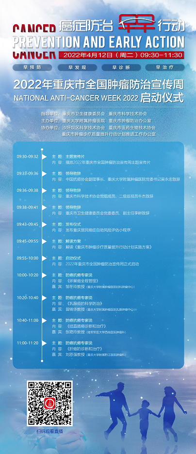 为认真贯彻落实癌症防治工作有关决策部署,推动落实健康中国癌症防治专项行动,提高全社会癌症防控意识,营造全民防癌抗癌的良好氛围,由重庆市卫生健康委员会、重庆市科学技术协会指导,重庆大学附属肿瘤医院、重庆市肿瘤防治办公室主办,沙坪坝区科学技术协会、重庆市医药生物技术协会、重庆市肿瘤诊疗质量提升行动计划推进工作办公室承办的2022年重庆市全国肿瘤防治宣传周启动仪式,将于4月12日(周二)上午9点30分,通过线上直播的形式举行。