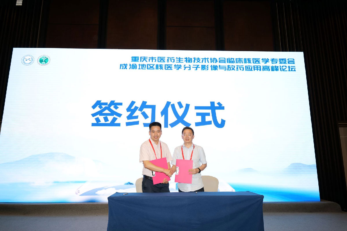 开幕式结束后,重庆市医药生物技术协会秘书长郑晓东主持成渝核医学战略合作协议签约仪式。重庆大学附属肿瘤医院核医学科陈晓良主任与与西南医科大学附属医院核医学与分子影像四川省重点实验陈跃主任现场签订合作协议。郑晓东秘书长强调:该合作背景是为了深入贯彻党中央关于推动成渝地区双城经济圈建设的指示精神,响应国家八部委《医用同位素中长期发展规划(2021-2035)》的战略部署,积极推广放射性药物临床应用及科学研究。以重庆大学附属肿瘤医院核医学科为主体的临床核医学学专委会,与西南医科大学附属医院核医学与分子影像四川省重点实验室基于国家的战略布置与政策导向,积极推进川渝地区核医学技术的深度融合发展,达成科研合作与人才培养、交流互访等战略合作。对促进核医学多中心技术研究,新核素创新与应用及转化具有重要意义。