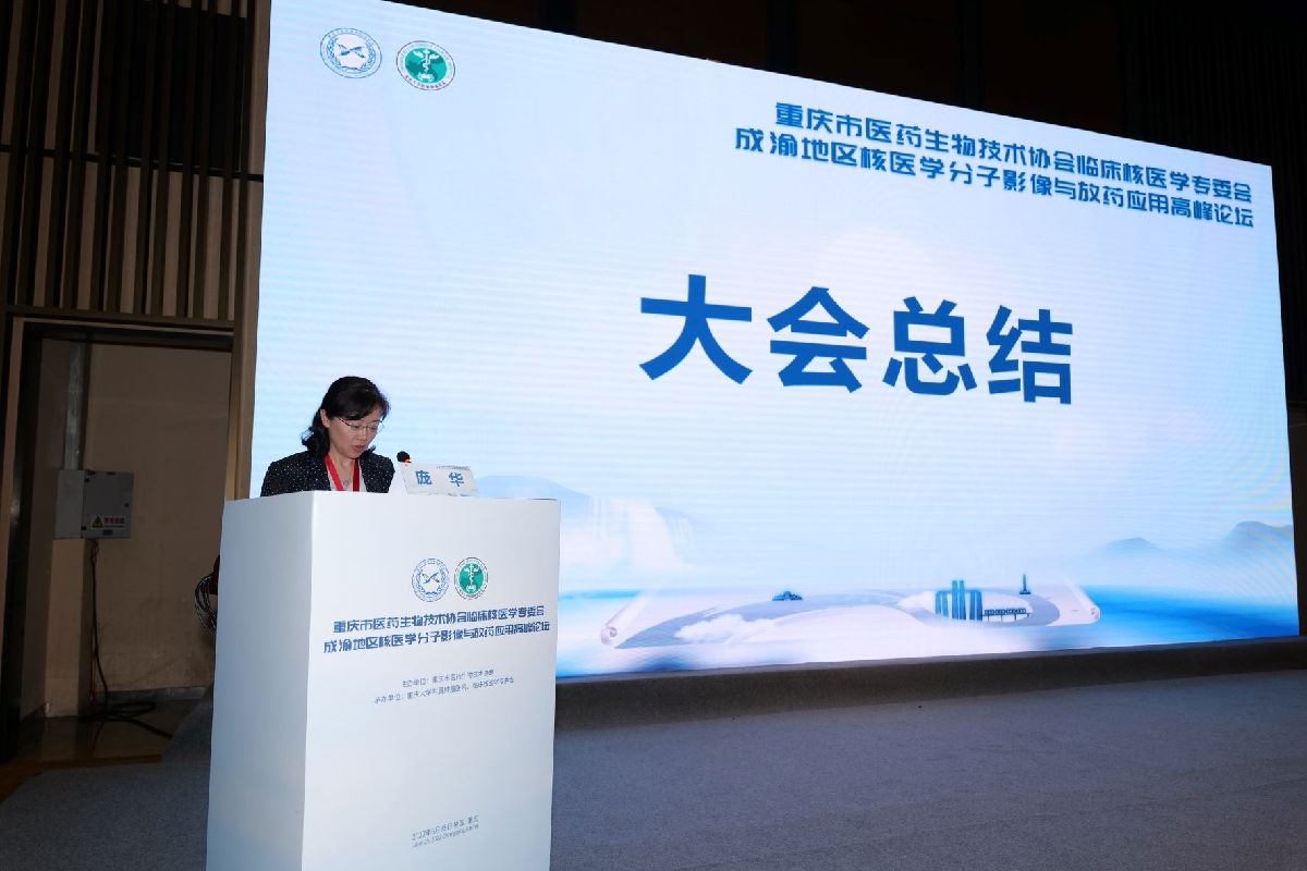 最后,重庆市医学会核医学分会主任委员、重庆市医药生物技术协会临床医学专委会副主任委员庞华教授从三个方面发表总结致辞。一是对本次会议的讲座内容做了简要的总概况结、并对每位讲者的内容给予高度的评价,通过本次科研院所的精彩分享,参会人员了解了国内核素及分子探针的研究动态,国外专家的线上讲座,又让大家了解国际的发展前沿,收获颇丰;二是指出本次会议促进了成渝地区核医学的沟通、交流、合作,尤其是放射性药物的多学科融合发展;三是对本次会议的主办方、参会者及支持单位再次表达感谢。希望临床核医学专委会在重庆市生物技术协会领导的带领下促进多学科联合、研发新型放射性药物,迎接更大的挑战,为川渝及地区的肿瘤防治事业做出重要的贡献。