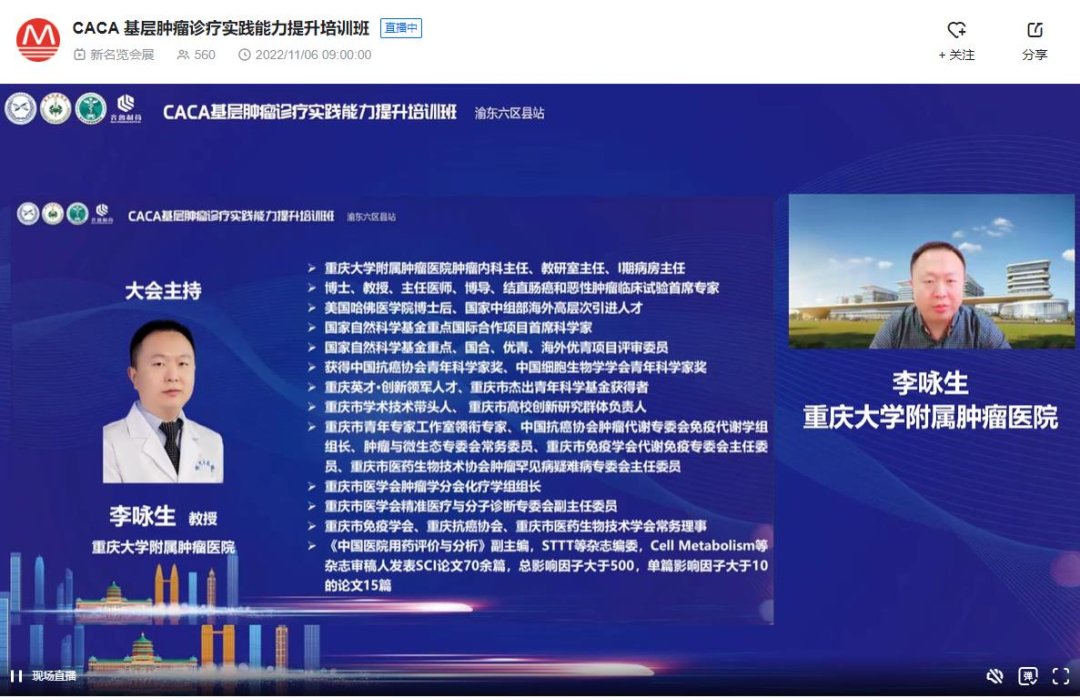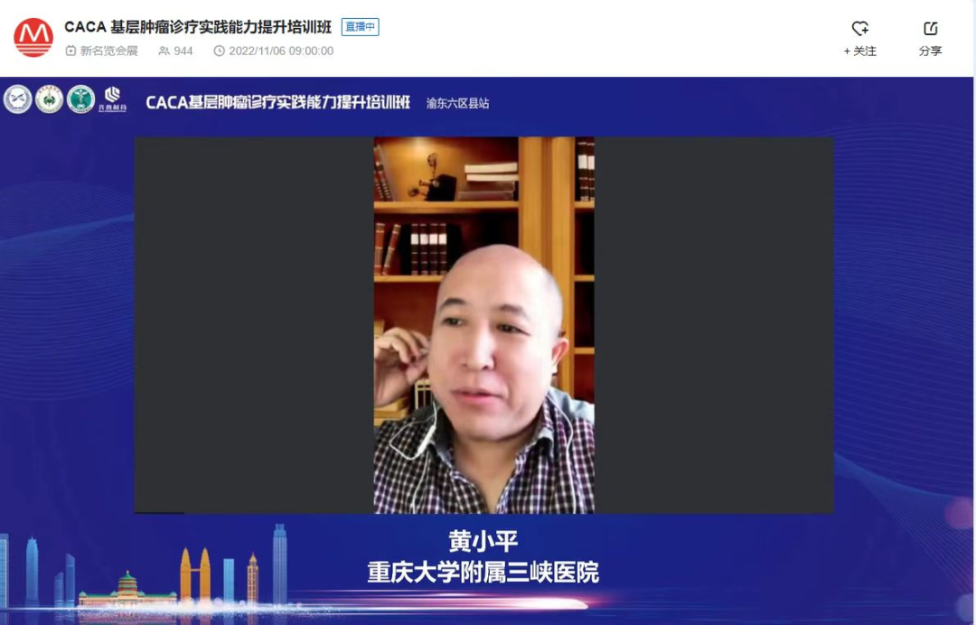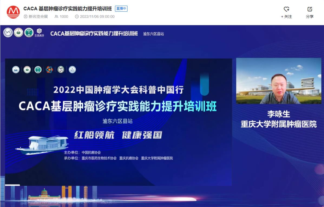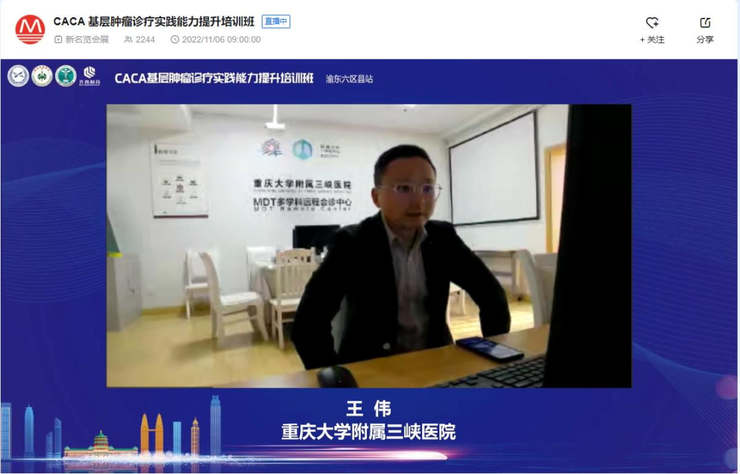 11月6日,由中国抗癌协会主办,重庆市医药生物技术协会、重庆抗癌协会、重庆大学附属肿瘤医院承办,中国抗癌协会(CACA)基层肿瘤诊疗实践能力提升培训会(渝东片区)通过线上的形式举行,来自三峡中心医院、梁平区人民医院、忠州区人民医院、云阳县人民医院、开州区人民医院和石柱县人民医院的相关专家参加本次线上培训。