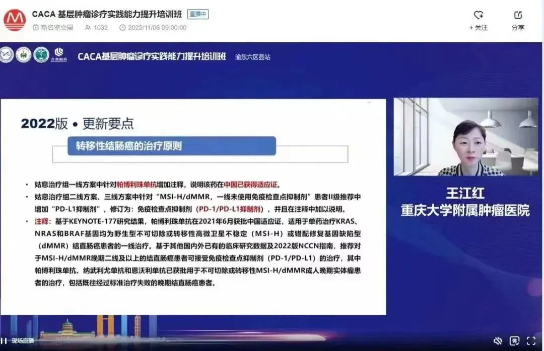 培训环节,由重庆大学附属三峡医院邓超主持,重庆大学附属肿瘤医院主任医师王江红作《转移性结直肠癌更新解读》专题讲座,针对指南中未纳入的晚期结直肠癌免疫治疗的热点问题进行详细的梳理。