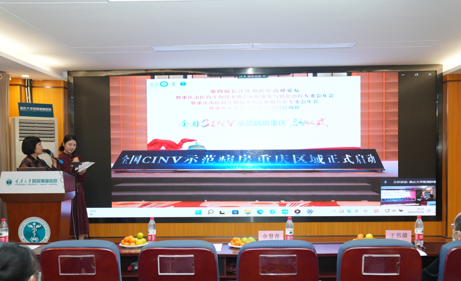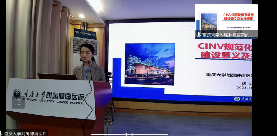 重庆大学附属肿瘤医院田玲作《肿瘤营养治疗新理念》专题讲座,重庆大学附属肿瘤医院杨鸿作《CINV规范化管理病房建设意义及执行概要》专题讲座,重庆大学附属肿瘤医院刘师宏作《创新引领-肿瘤支持全程化管理设想》讲座