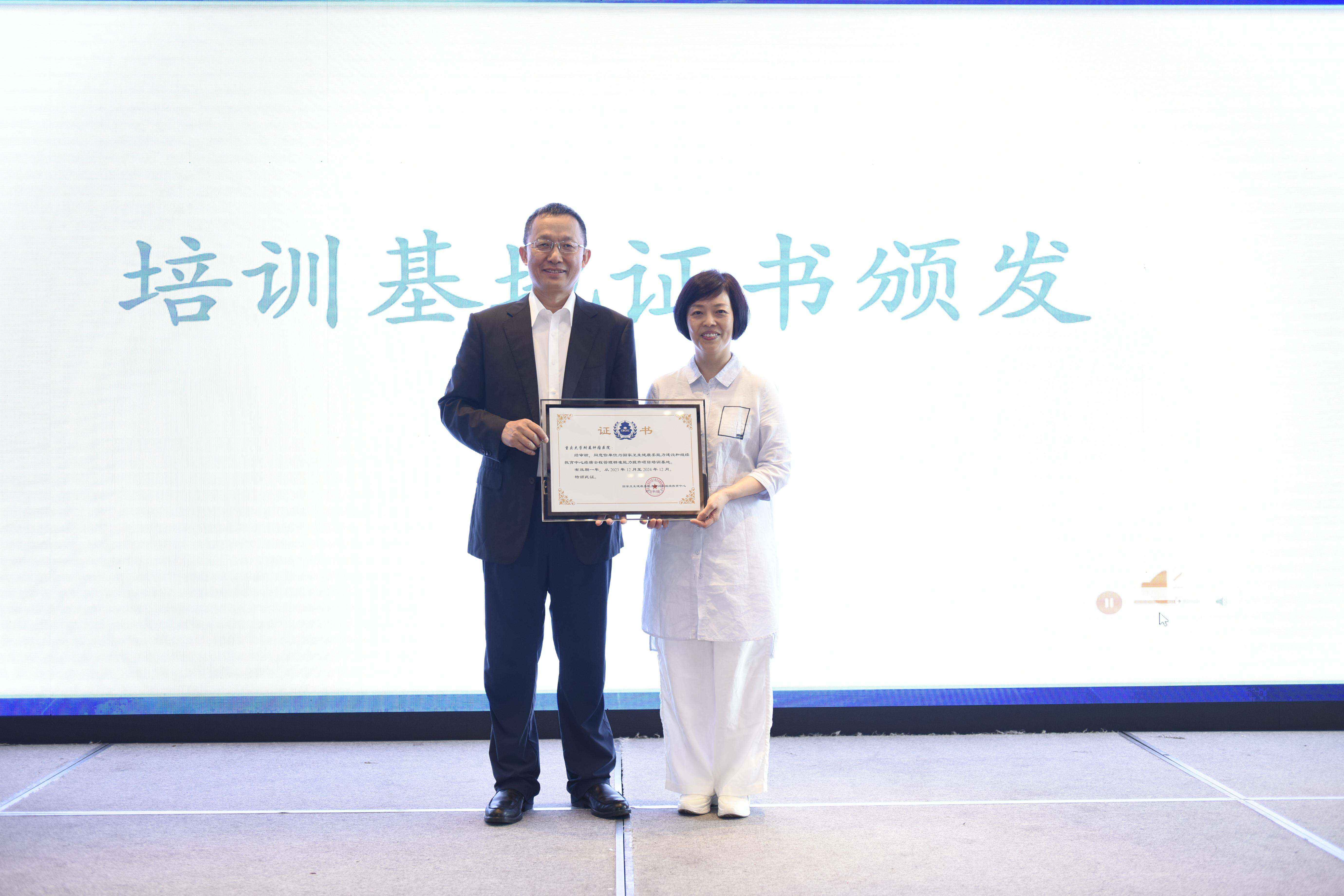 在授牌仪式上,樊碧发教授、王永教授、周宏教授、郑晓东秘书长代表国家卫生健康委能力建设中心PMT项目组向重庆区域培训基地负责人及讲师分别颁发了证书。