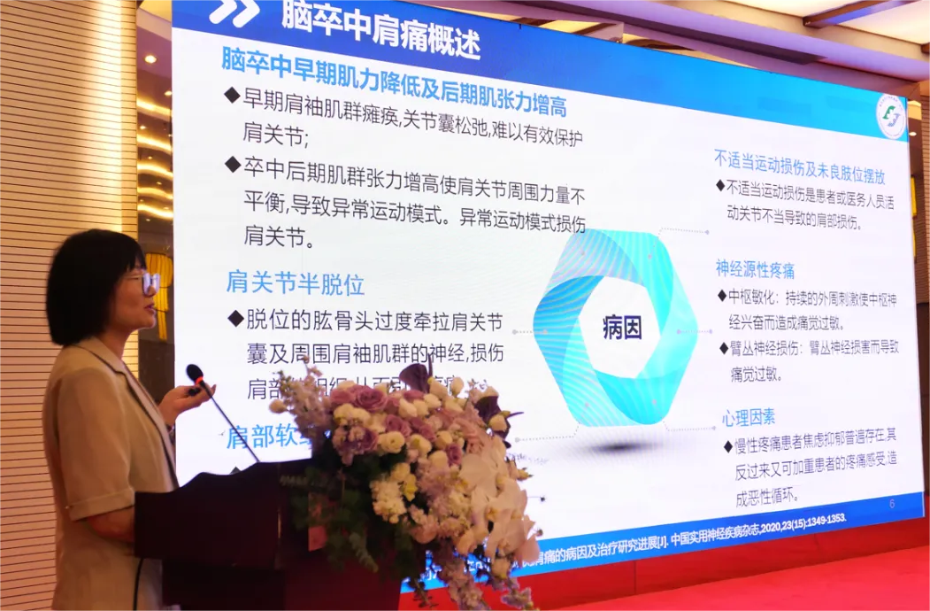 重庆医科大学附属第一医院康复医学科副主任护师刘玲分享了“脑卒中后肩痛的康复护理策略”。强调了康复评估的方法和重要性,通过科学准确的评估为后续的治疗和护理提供依据。随后深入的阐述了康复的治疗和护理。