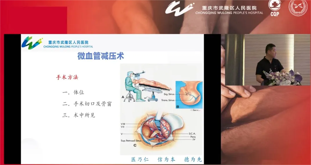 重庆市武隆区人民医院神经疾病科主任刘强上台分享“三叉神经痛诊治”。着重对治疗方法进行深入的讲解,包括药物治疗,常用药物的作用机制和用药调整策略。手术治疗,如微血管减压术、半月节微球囊压迫术等,并强调了综合治疗的重要性。