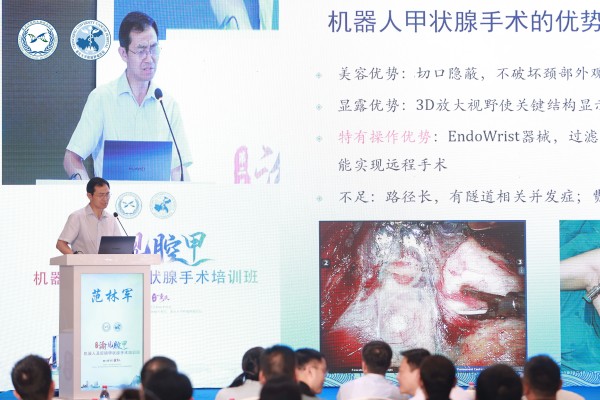 中国人民解放军总医院田文教授作《机器人技术在甲状腺手术中的应用》专题报告。他提出,机器人技术及腔镜技术对甲状腺疾病患者的重大意义,并分享机器人技术在甲状腺手术中的应用,包括不同入路机器人辅助操作的手术视频,并提出了机器人手术系统辅助甲状腺和甲状旁腺手术临床实践指南,对机器人及腔镜甲状腺手术的规范性和安全性有更高的要求,还对机器人技术的未来发展与挑战有新的思考。