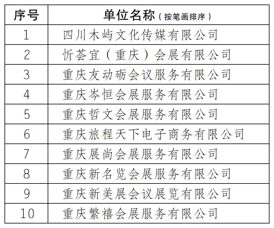 为公正公开招募遴选会务服务合作单位,按照《关于更新重庆市医药生物技术协会会务会展服务公司名录的通知》要求,经报名资格初审、复审、协会会议研究决定,确定重庆旅程天下电子商务有限公司等10家公司为入选单位(入选名单见下表),现予以公示。