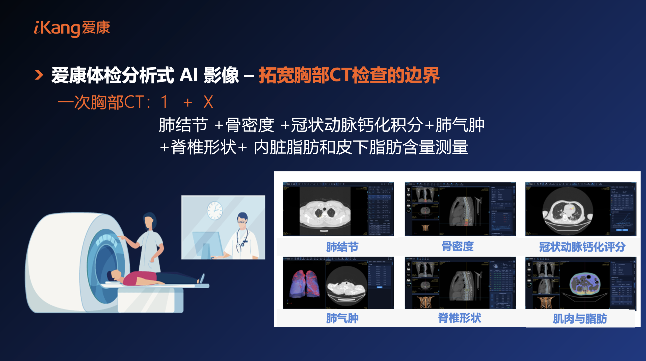 CT为例,爱康每年为超200万人次进行胸部CT检查,都会通过AI进行阅片。由AI快速筛查出结节等异常指标,再由影像科医生进行专业判断,“AI初筛+医生集中阅片的模式,让效率得到了大幅提升。此外,在爱康拍摄一次胸部CT,可以同时完成肺部筛查、脊柱骨密度、冠状动脉钙化积分评估冠状动脉风险、腹腔内脂肪量和肝脏脂肪含量测量,大大提高了检查的广度与深度。