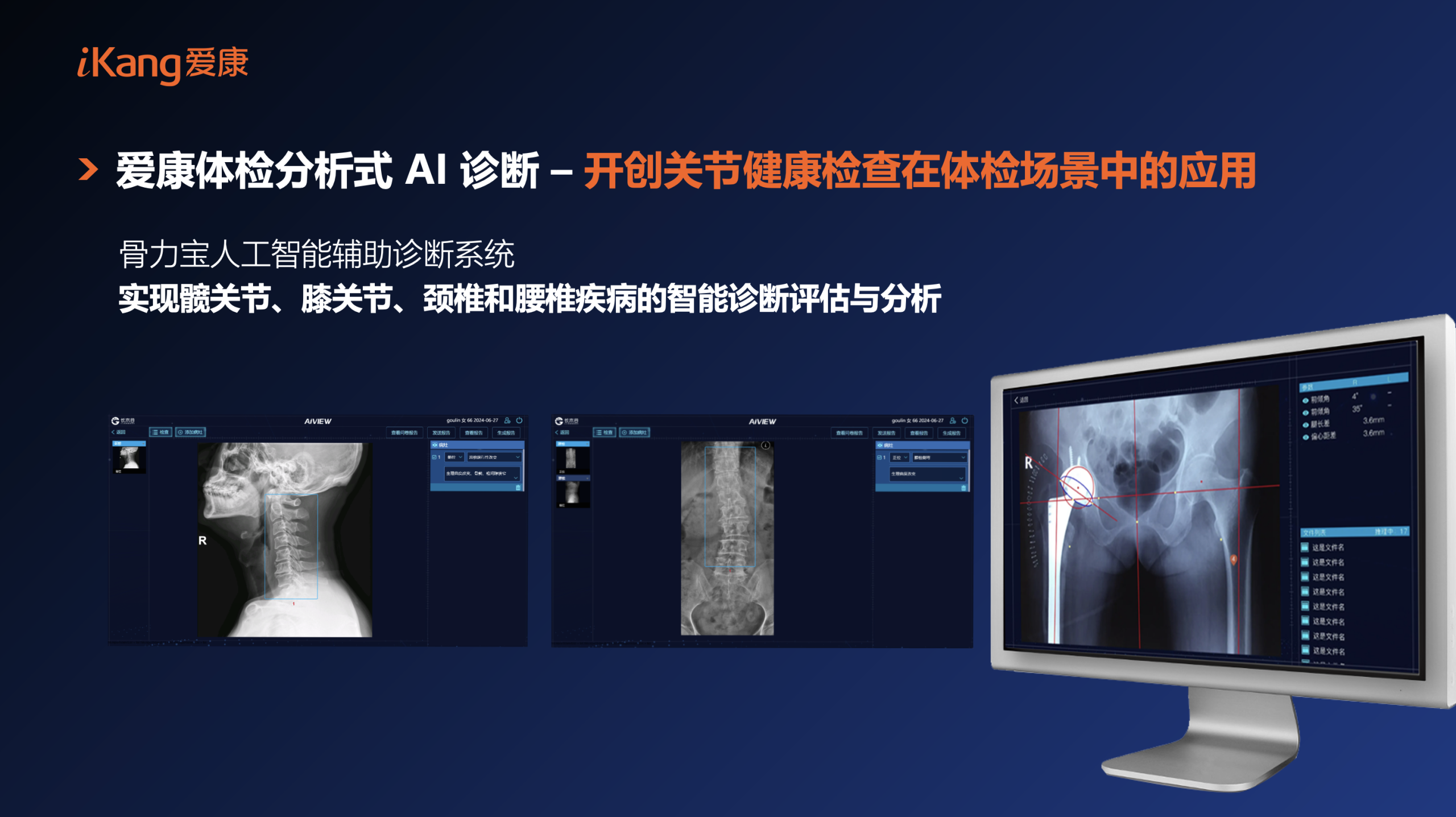 在我国40岁以上人群中,约46%患有骨关节炎,但骨科医师数量有限,骨关节健康筛查从来就不属于常规体检项目。2023年,爱康联合骨关节人工智能公司长木谷率先在体检行业内将基于人工智能的下肢骨关节健康评估纳入健康体检中——拍摄一张下肢关节的X光片,AI即可辅助医生完成一系列骨关节健康评估,对于需要进一步筛查的,在这个基础上做进一步的CT检查,同时,爱康已与一些权威三甲医院的骨科科室建立了从筛查、诊断到人工关节置换的一体化服务体系。人工智能体检的模式,让优质医疗服务突破了专家资源瓶颈,惠及更多普通群众。