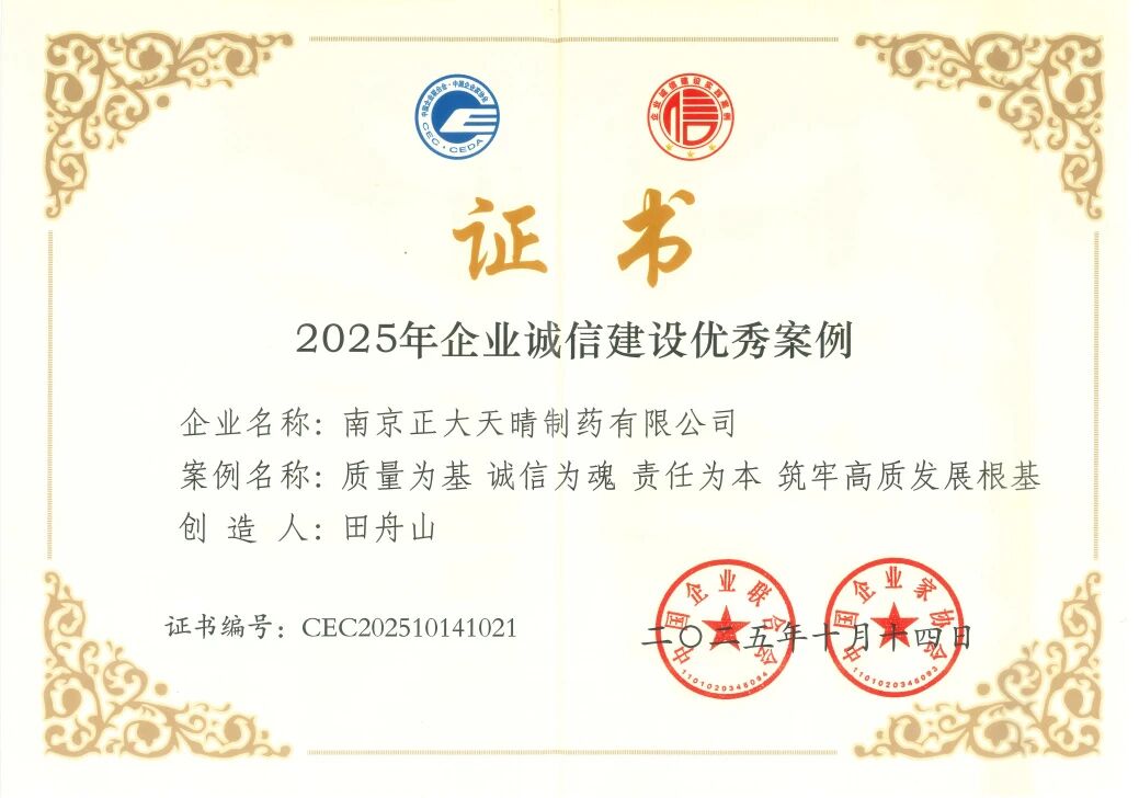 近年来,南京正大天晴持续深化诚信体系建设,始终将诚信建设贯穿于企业质量管理、绿色制造、合规经营等生产经营方方面面。此次获评“2025年企业诚信建设优秀案例”,是公司获评江苏省守合同重信用企业后,在诚信建设道路上取得的又一项重要成果。下一步,公司将坚守“以诚制药 用心守护”的理念,继续以诚信为立业基石,持续筑牢诚信制度根基,培育诚信文化,恪守诚信经营准则,努力打造值得信赖的中国医药创新企业典范。