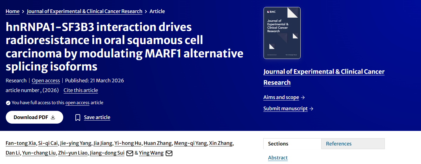 近日,重庆大学附属肿瘤医院肿瘤放射治疗中心王颖教授、隋江东教授团队在Journal of Experimental & Clinical Cancer Research(中科院一区,IF=12.8)在线发表题为《hnRNPA1‑SF3B3 interaction drives radioresistance in oral squamous cell carcinoma by modulating MARF1 alternative splicing isoforms》(hnRNPA1-SF3B3相互作用调控MARF1可变剪接异构体驱动口腔鳞状细胞癌放疗抵抗)的研究论文。该研究首次阐明hnRNPA1-SF3B3-MARF1调控轴通过可变剪接重编程驱动口腔鳞癌放疗抵抗的分子机制,为破解临床放疗耐受难题、开发精准增敏策略提供全新靶点与理论支撑。