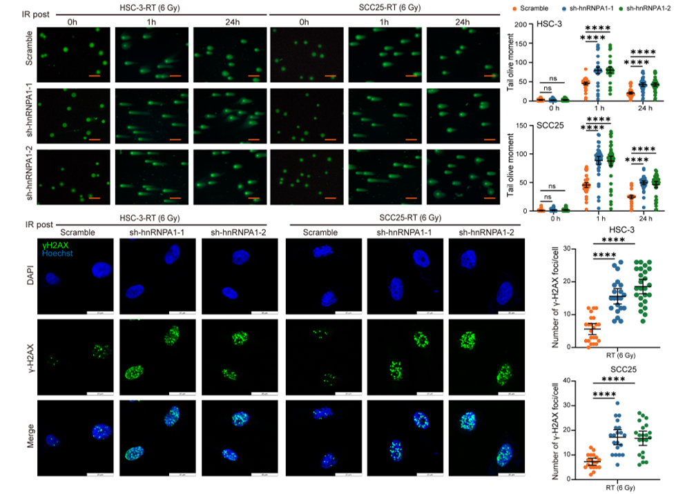 口腔鳞癌(OSCC)是头颈部最常见恶性肿瘤,放疗是主要治疗手段,但放疗抵抗常导致局部复发与治疗失败。团队通过放疗小鼠模型RNA测序、临床队列验证与TCGA大数据分析发现:hnRNPA1在OSCC组织中显著高表达,且放疗后进一步上调;高表达 hnRNPA1与患者放疗不敏感、生存期缩短密切相关;敲低hnRNPA1可显著抑制肿瘤增殖、加重DNA双链断裂损伤,逆转放疗抵抗。