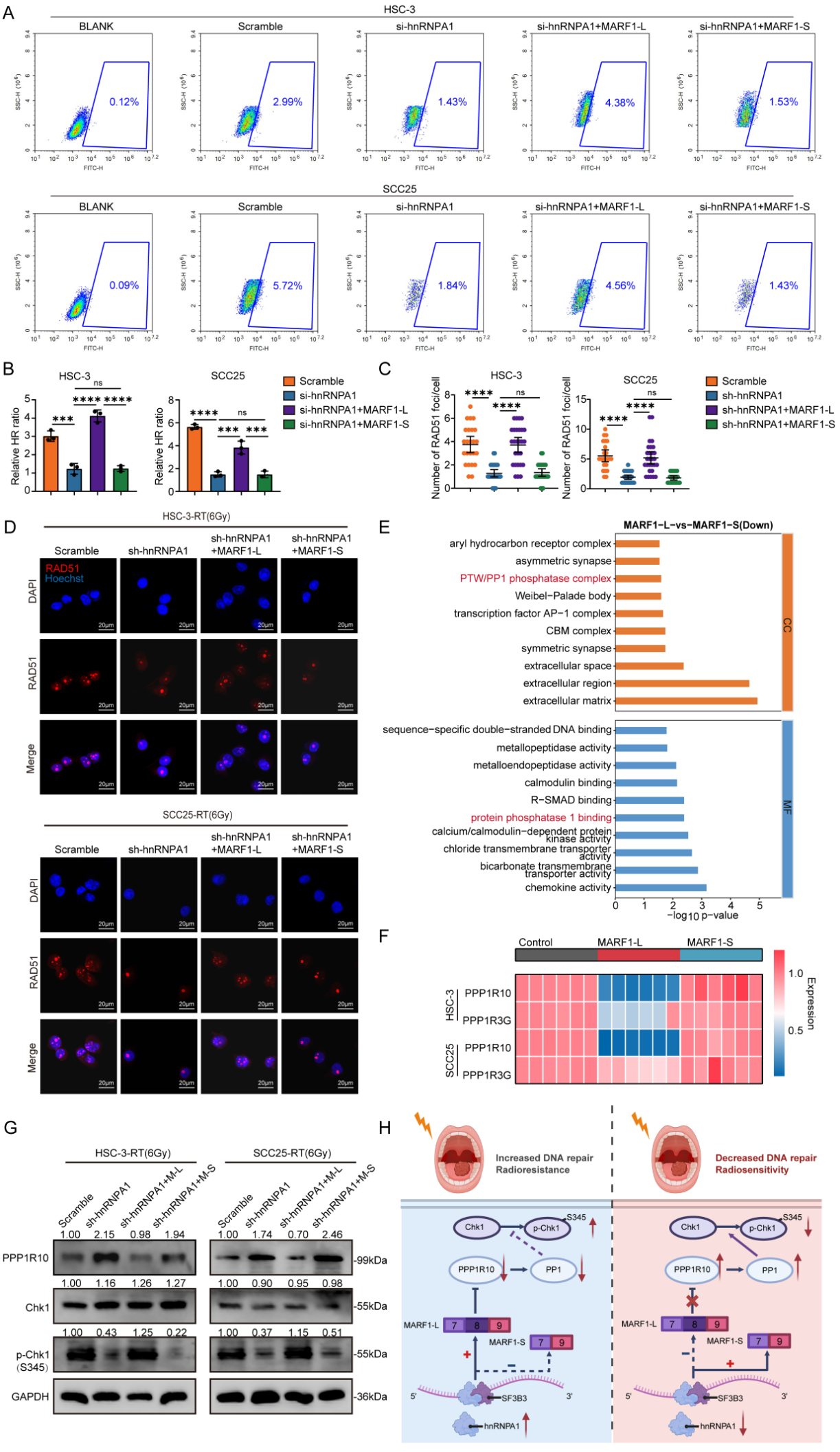 功能层面,MARF1-L凭借其RNA结合与降解活性,特异性靶向降解PPP1R10 mRNA,从而解除其对蛋白磷酸酶PP1的抑制作用,进而增强Chk1 Ser345位点磷酸化,强效激活同源重组修复(HR)通路,显著提升肿瘤细胞对放疗所致DNA双链断裂的修复效率,最终介导放疗抵抗。本研究将异常可变剪接与DNA损伤修复耦联,为临床克服放疗抵抗、制定精准联合治疗策略提供了坚实的机制基础与明确的干预方向。