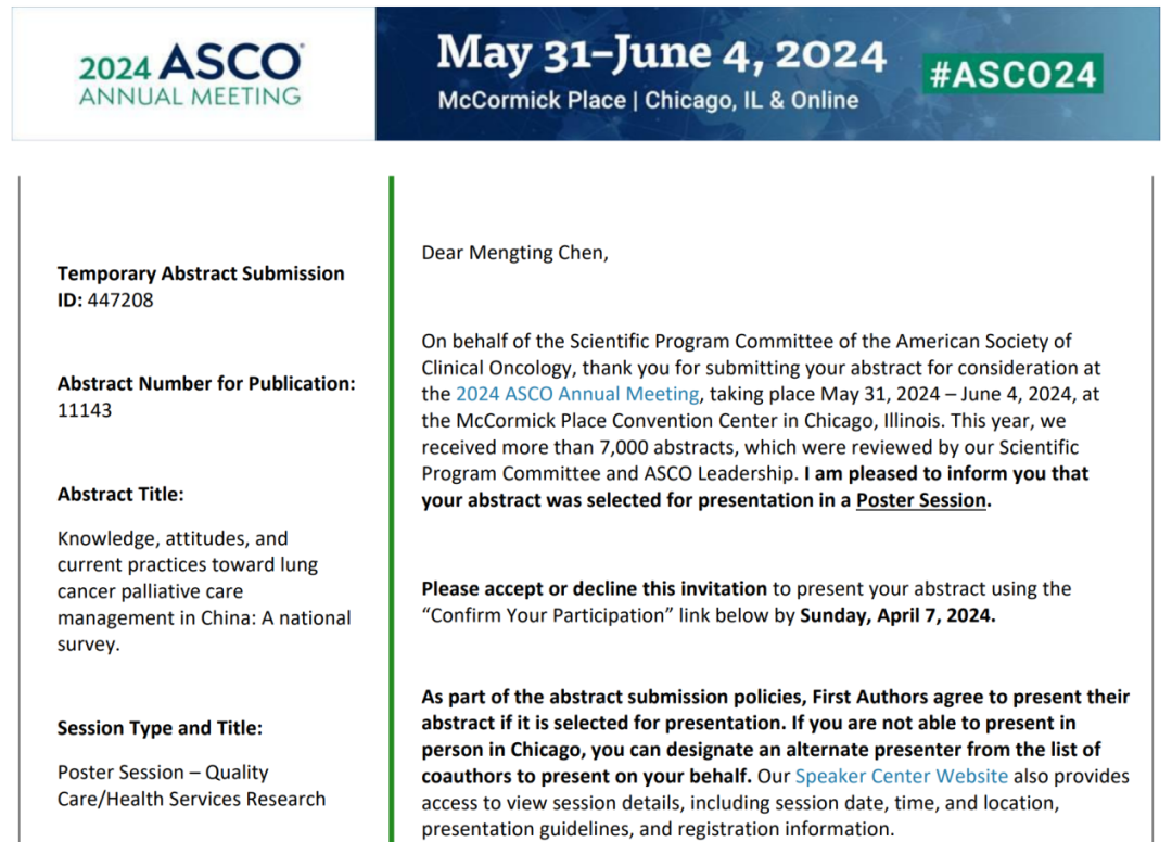 2024年美国临床肿瘤学会(ASCO)年会于2024年5月31日-6月4日在美国芝加哥举行,是世界上最大、最具影响力的肿瘤专业学术组织年会。余慧青教授团队1项研究入选壁报交流(POSTER display),2项收录论文集(online publication)。