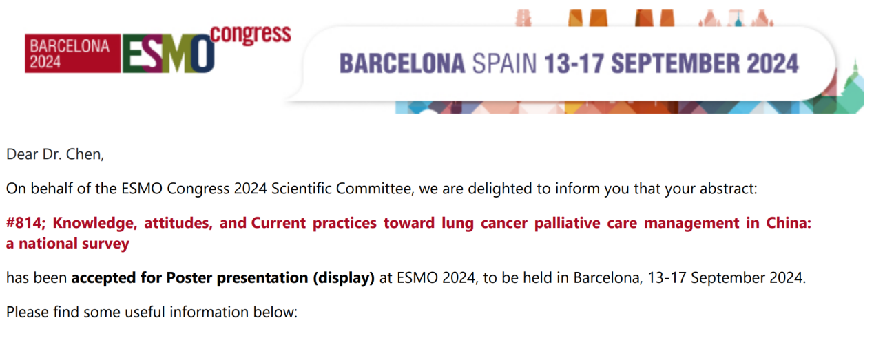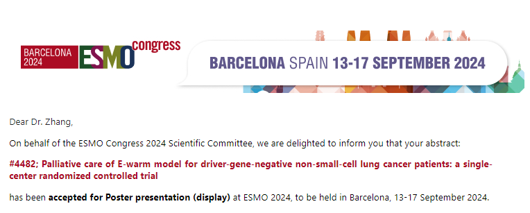 2024年欧洲肿瘤内科学会(ESMO)年会,将于2024年9月13-17日在西班牙巴塞罗那举行,是本领域最具影响力的国际权威学术会议之一。余慧青教授团队3项研究入选壁报交流(POSTER display)。