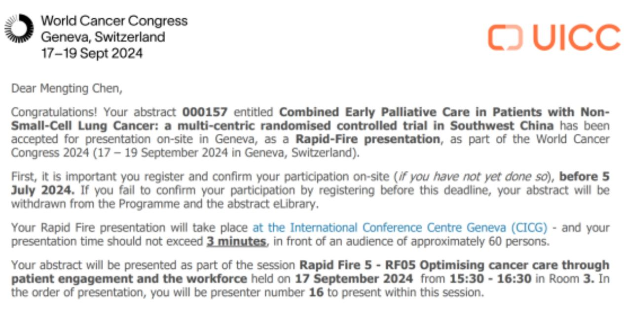 2024年世界癌症大会(WCC 2024)将于2024年9月17日至19日在瑞士日内瓦举行,是公认的国际学术交流盛会。余慧青教授团队1项研究入选口头报告(Rapid Fire),3项研究入选壁报交流(POSTER display)。