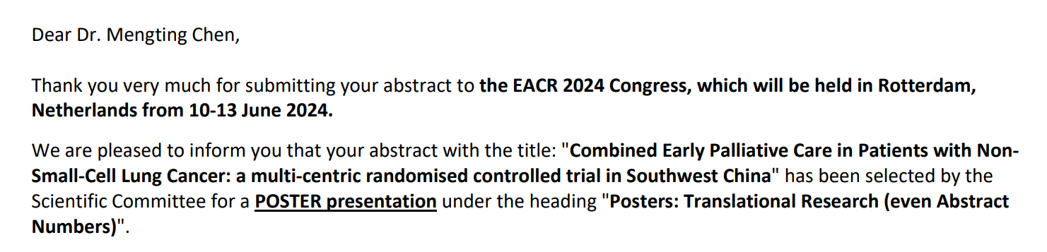 2024年欧洲癌症研究协会(EACR)年会已于2024年6月10日至13日在荷兰鹿特丹举行,余慧青教授团队5项研究入选壁报交流(POSTER presentation)。