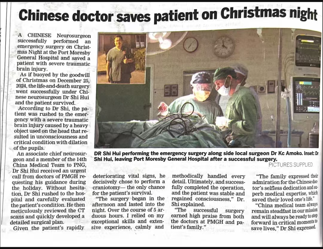12月25日圣诞节,是巴布亚新几内亚(以下简称“巴新”)人民阖家欢乐共迎新年的日子。当日,来自我院神经外科的石会医生在巴新的莫尔兹比港总医院(以下简称“莫港总院”)面临了一场“生死时速”紧急救治的考验,他用实际行动生动诠释了中国医生大爱无疆的精神。该救治事迹被当地国家级报纸《巴新邮报》(1月8日版)报道。