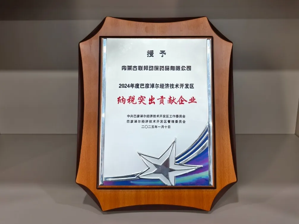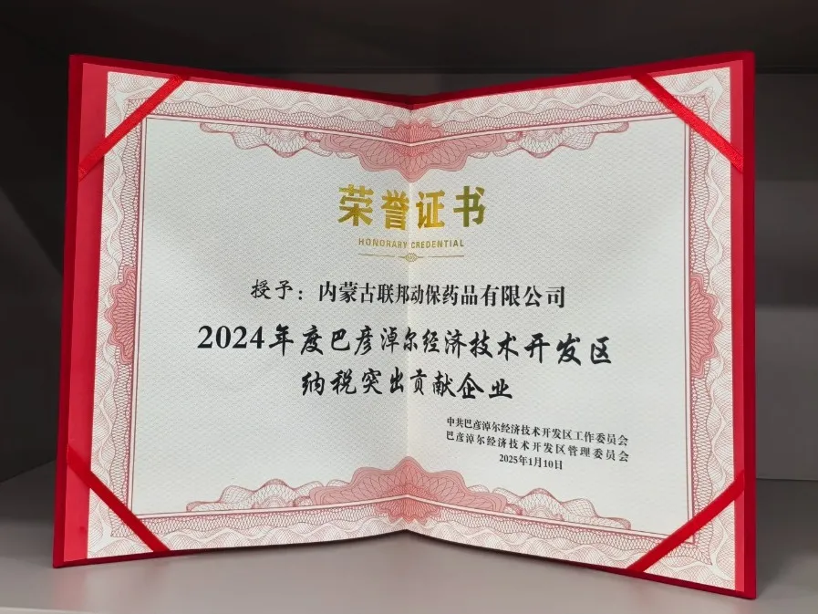近日,内蒙古联邦动保药品有限公司荣获 2024 年度巴彦淖尔经济技术开发区 “纳税突出贡献企业” 称号。这一荣誉不仅是对公司过去一年经营成果的高度肯定,更是对公司积极履行社会责任、助力地方经济发展的有力褒奖。