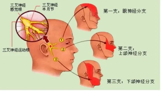 三叉神经痛,疼痛剧烈,疼痛评分高于分娩疼痛。患者轻微的小动作,如洗脸、刷牙、吃饭甚至是说话,都能刺激和触发疼痛。三叉神经是是十二对脑神经中的第5对脑神经(V脑神经),属于混合神经,含一般躯体感觉和特殊内脏感觉运动纤维,由三大分支汇合而成: