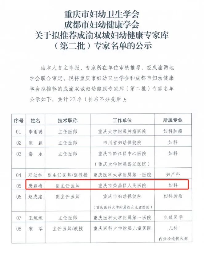 荣昌区人民医院唐春梅成功入选成渝双城妇幼健康专家库