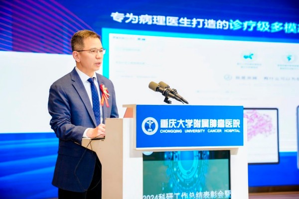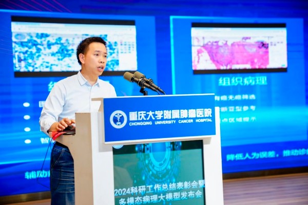 在发布会上,重庆大学附属肿瘤医院智能肿瘤学研究中心常务副主任蔡文立与重庆大学附属肿瘤医院病理科副主任姜青明深入解析了“灵眸”的核心技术及应用价值,并现场演示其在肿瘤病理分析、科研教学辅助、智能化工作流程优化等领域的实际应用。