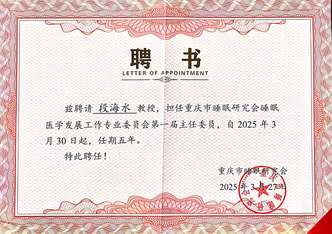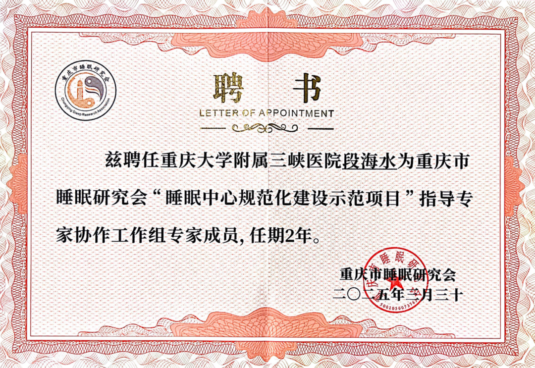 3月30日,重庆市睡眠研究会专业委员会在重庆正式成立,会上公布了全市首批六家睡眠医学中心规范化建设示范单位,三峡医院心身睡眠科成功入选。心身睡眠科主任段海水受聘为重庆市睡眠研究会“睡眠中心规范化建设示范项目”指导专家协作工作组专家成员,并当选重庆市睡眠研究会睡眠医学发展工作专业委员会第一届主任委员。