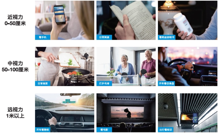 全视觉三焦点人工晶体利用精密复杂的光学原理设计了多个焦点,实现了由远及近多个位置距离上的物体均能够聚焦于视网膜上形成清晰的像,从而满足人们日常生活中所需要的远、中、近全程视力,摆脱戴镜烦恼,是当前全球领先的老视白内障解决方案。