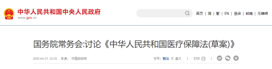 4月27日,国务院常务会议召开,会议讨论并原则通过《中华人民共和国医疗保障法(草案)》,决定将草案提请全国人大常委会审议。