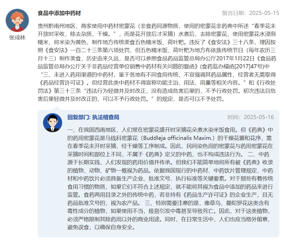 1.在我国西南地区,人们常在密蒙花盛开时采摘花朵煮水染米饭食用。但《药典》中的药用密蒙花是马钱科密蒙花(Buddleja officinalis Maxim.)的干燥花蕾和花序,需在春季花未开时采摘,经干燥等工序制成。因此,民间染色用的密蒙花与药用密蒙花在采摘时间和部位上不同,不属于《药典》定义的中药,也不构成违法行为。