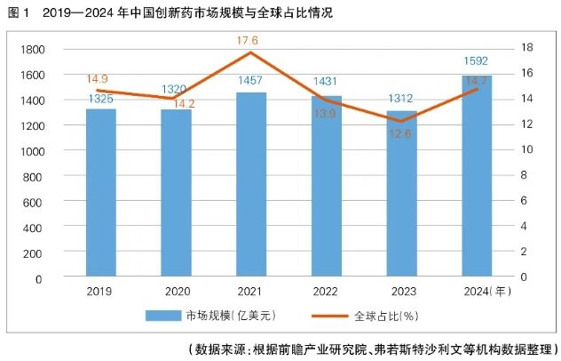 综合前瞻产业研究院、弗若斯特沙利文等机构数据,我国创新药市场规模由2019年的1325亿美元增至2024年的1592亿美元(详见图1),在全球占比总体保持在15%左右;据预测,2030年中国创新药市场规模有望突破3000亿美元,全球占比继续提升。