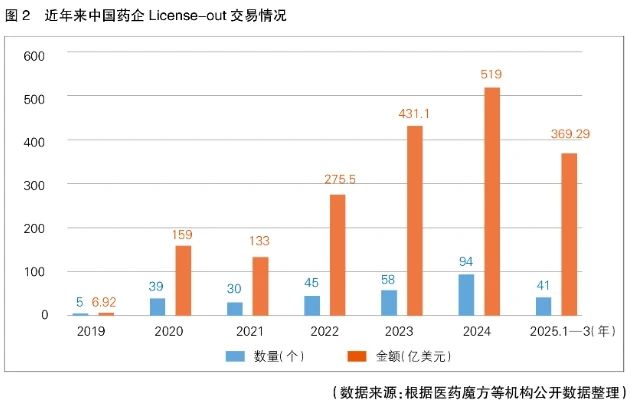 医药魔方数据显示,2024年中国创新药对外授权交易(Licenseout)完成94笔,出海交易总金额高达519亿美元,同比增长26%;2025年1月—3月,中国License-out交易已有41起,总金额达369.29亿美元,均再创同期历史新高(详见图2)。