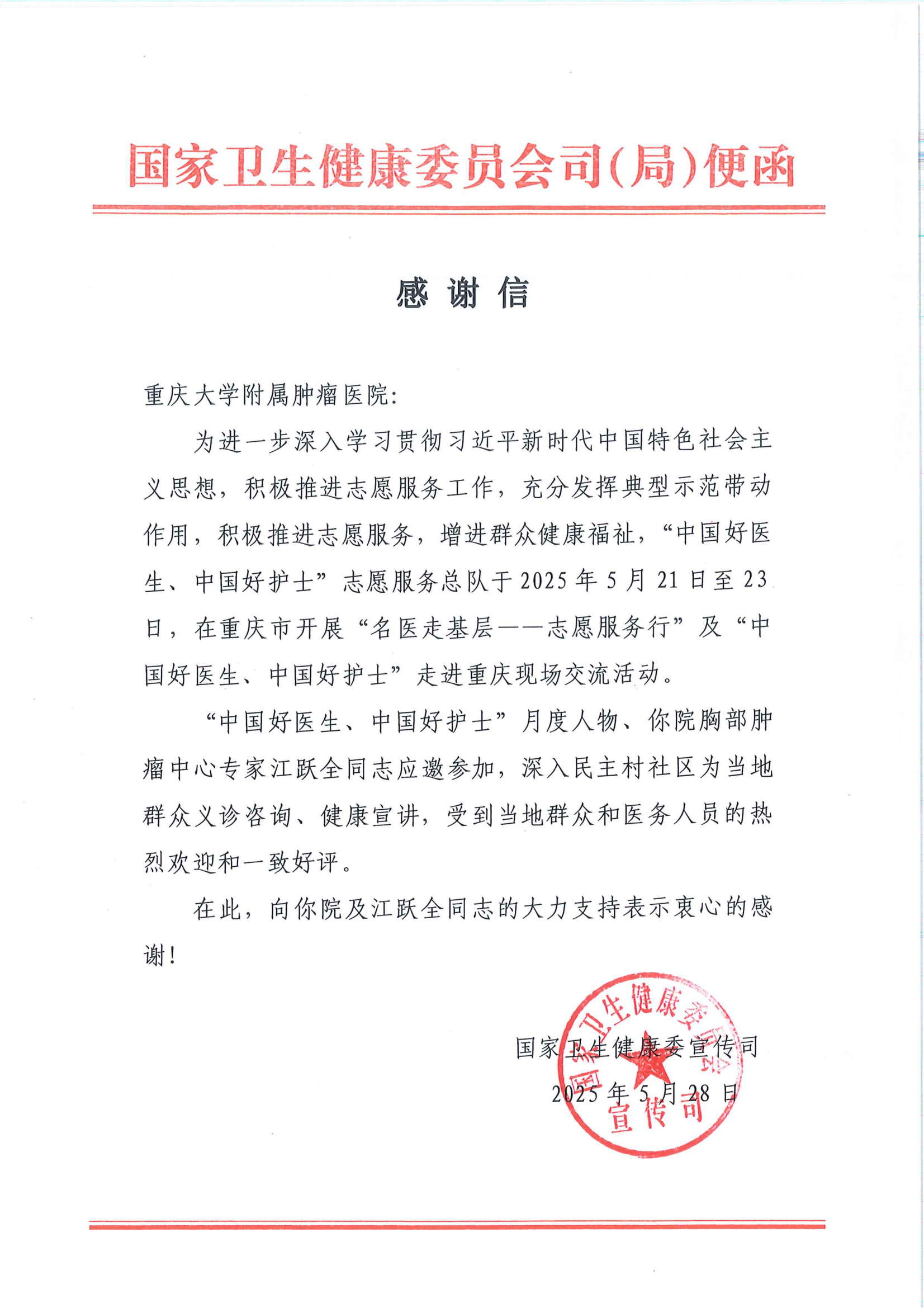 会员之窗 | 重庆大学附属肿瘤医院:把优质医疗服务送上门!“中国好医生”江跃全教授收到国家卫健委发来的感谢信